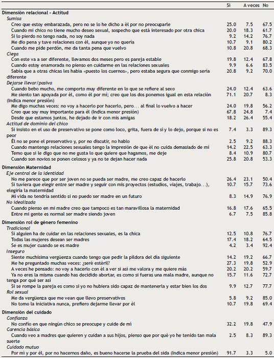 En estos datos se observa que aunque la mayor??a de las encuestadas demuestran asertividad, en la cual reafirman sus derechos sexuales y reproductivos sin dejarse llevar por estereotipos de g??nero, todav??a algunas de las estudiantes manifiesta una actitud sumisa: el 10% no piensa en la planificaci??n familiar si se sienten enamoradas, el 10.7% no toma la iniciativa en las relaciones sexuales por ser mujer, el 7.4% acepta que su pareja se niegue a ponerse el preservativo o no dice nada el 2.5%. Asimismo, a m??s del 14% de las j??venes les da verg??enza solicitar la anticoncepci??n de emergencia y al 5,8% le da verg??enza que le vean que lleva preservativos, lo cual demuestra que a??n persiste la interiorizaci??n de la anticoncepci??n como un tema tab??. Adem??s, el 10.7% abandonar??a sus proyectos personales por la maternidad, y m??s del 8% afirma que su vida no tendr??a sentido si no puede ser madre.