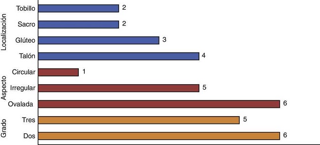 Con relaci??n a la localizaci??n de la ??lcera, se observan cifras similares a las dadas por Vela-Anaya9, quien mencion?? que la frecuencia del sitio anat??mico de las UPP fue el sacro en un 27% y el tal??n en otro 27%. Pesantes Masabanda22 menciona en su investigaci??n la localizaci??n de las ??lceras en sacro, talones y gl??teos, pues son las mayores prominencias ??seas que cizalla la piel en la posici??n anat??mica dec??bito supino con menor cantidad de tejido.