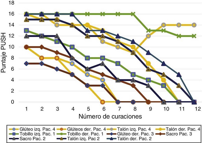 El paciente n??mero 4 present?? 4 UPP, 2 de grado II en ambos gl??teos y 2 de grado III en ambos talones. Las lesiones en los gl??teos tuvieron un comportamiento casi id??ntico: iniciaron en PUSH de 10 y terminaron en 0 hacia la semana 6 el gl??teo derecho y hacia la semana 7 el gl??teo izquierdo. Las lesiones en los talones iniciaron con puntaje PUSH de 16 y solo el tal??n derecho se cur?? en la semana 11, mientras que la ??lcera en el tal??n izquierdo hacia la sesi??n 12 puntu?? 14 (fig. 2).