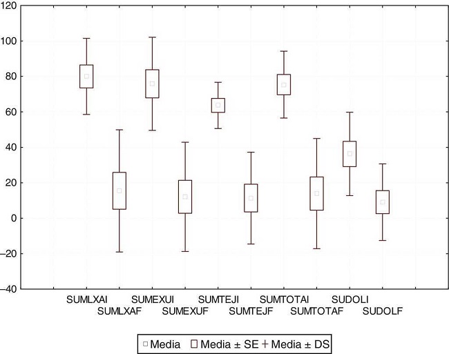 Tambi??n, se midi?? la diferencia de medias del total de ??lceras al inicio de la intervenci??n y al final, con el fin de observar el avance de las ??lceras en las ??reas que abarca el instrumento PUSH. El puntaje final PUSH inici?? con una x?? de 78 para terminar en una x?? de 15. Con relaci??n al ??ndice de longitud por anchura, inici?? con una x?? de 80 y termin?? con una x?? de 17 (fig. 3). Adem??s, existi?? significaci??n estad??stica con relaci??n al antes y despu??s de cada una de las variables del instrumento PUSH bajo el estad??stico de rangos de Wilcoxon (tabla 1).