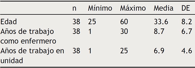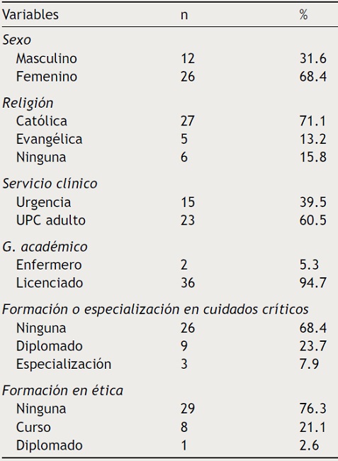 La muestra se caracteriza por tener una edad promedio de 33.6 a??os (DE ?? 8.2), con una media de 8.7 (DE ?? 6.7) a??os como enfermeras/os y 6.9 a??os de promedio de trabajo en unidades cr??ticas (DE ?? 4.6) (tabla 1). Mayormente son mujeres (68.4%), de religi??n cat??lica (71.1%), y del servicio cl??nico UPC adulto (60.5%). En perfil acad??mico, el 94.7% de las personas son licenciadas, el 68.4% no tienen formaci??n o especializaci??n en unidades cr??ticas y el 76.3% no poseen formaci??n en ??tica (tabla 2).