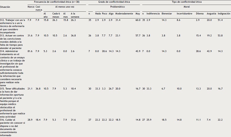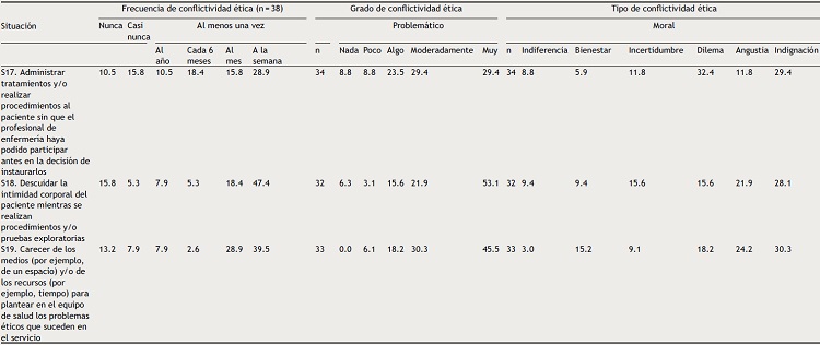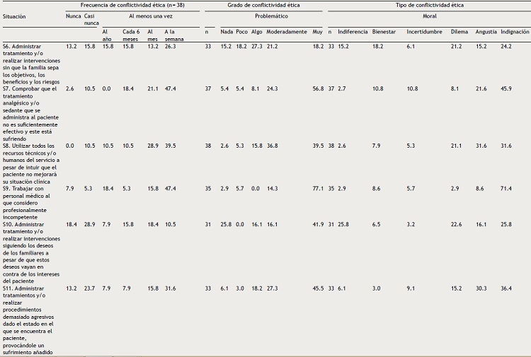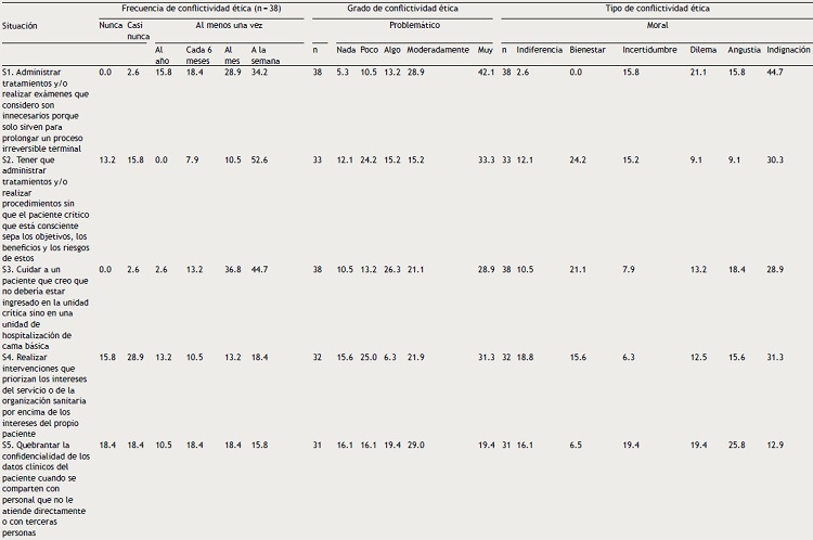 La situaci??n de mayor frecuencia de conflictividad ??tica, (al menos una vez a la semana), es ??Tener que administrar tratamientos y/o realizar procedimientos sin que el paciente cr??tico que est?? consciente sepa los objetivos, los beneficios y los riesgos de estos??, con un 56.2%; le contin??an con un 47.4% las situaciones n.o 7, 9 y 18: ??Comprobar que el tratamiento analg??sico y/o sedante que se administra al paciente no es suficientemente efectivo y este est?? sufriendo??, ??Trabajar con personal m??dico al que considero profesionalmente incompetente?? y ??Descuidar la intimidad corporal del paciente mientras se realizan procedimientos y/o pruebas exploratorias?? (tabla 3). El grado de conflictividad se presenta tambi??n en la tabla 3; las situaciones percibidas como ??muy problem??ticas?? fueron las n.o 9, 12, 13 y 7: ??Trabajar con personal m??dico al que considero profesionalmente incompetente??, con un 77.1%; ??Trabajar con un/a enfermero/a o un/a t??cnico de enfermer??a al que considero incompetente??, con un 60%; ??Actuar en contra de las convicciones morales debido a la falta de tiempo para atender al paciente??, con un 57.7%, y ??Comprobar que el tratamiento analg??sico y/o sedante que se administra al paciente no es suficientemente efectivo y este est?? sufriendo??, con un 56.8%.