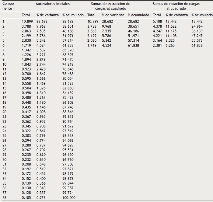 Se tomó como criterio de extracción de factores valores propios superiores a uno (tabla 1). Se aprecia el listado de los autovalores de la matriz de varianzas-covarianzas y del porcentaje de varianza que representa cada uno de ellos. Los autovalores expresan la cantidad de la varianza total que está explicada por cada factor y los porcentajes de varianza explicada asociados a cada factor se obtienen a través de la división del autovalor por la suma de autovalores. El análisis factorial arrojó una estructura de seis componentes que dan cuenta del 61.83% de la varianza explicada la cual es satisfactoria y suficiente.