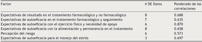 El primer factor agrupó los ítems del 19 al 26, correspondientes en su totalidad al componente teórico de expectativas de resultado, en el cual están inmersas las dimensiones temáticas de uso y seguimiento farmacológico, capacidad de realizar ejercicio físico, dieta saludable y manejo del estrés. Este factor se denominó Expectativas de resultado en el tratamiento farmacológico y no farmacológico, incluye ítems que miden la percepción del paciente con relación a los resultados positivos cuando este ejecuta comportamientos ligados a la adherencia al tratamiento.