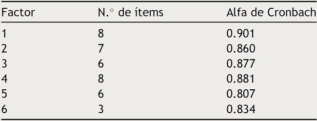En primer lugar se realizó el análisis de validez discriminante el cual permite distinguir variables que agrupan ítems y que difieren de otros agrupamientos. Esta técnica se basa en el análisis con una matriz de correlaciones para realizar diversos agrupamientos, de manera que optimice cada grupo en cuanto a sus correlaciones y los diferencie de los otros grupos. En la presente investigación se decidió hacer la identificación de agrupaciones de los ítems a partir del análisis ítem-total37 (correlación punto-biserial), así como tomar en cuenta que cada uno de los conjuntos de ítems agrupados se considera como una posible variable, si esta se compone de más de tres ítems y si la correlación positiva con el conjunto es superior a 0.196. Como se observa en la tabla 3, los seis factores cumplen con los criterios antes descritos, por lo que determinan que los ítems que lo componen se comportan como una dimensión.