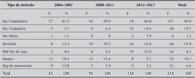 El total de artículos publicados entre 2004-2017 fue de 318, es hasta los dos últimos años en que se incrementa el total de artículos incluidos por número. En la revista se consideran básicamente tres secciones de acuerdo al tipo de artículo, pero en la Tabla 1 se decidió mostrar la información más desagregada. La mitad del total de artículos corresponde a investigación cuantitativa, 11% a cualitativa, un porcentaje similar de artículos de revisión y la cuarta parte restante la constituyen los artículos comprendidos en la sección de innovación para la práctica: procesos de atención de enfermería/estudios de caso, ensayos o experiencias de innovación para la práctica.