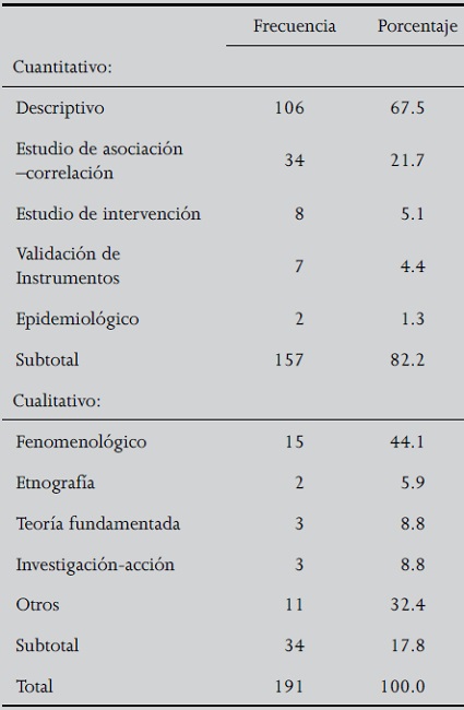 De la misma manera, el uso predominante del diseño descriptivo ha sido identificado desde 1990, tanto en la investigación realizada en México como en la de otras regiones de Iberoamérica2-4. Los datos mostrados aquí confirman su persistencia.