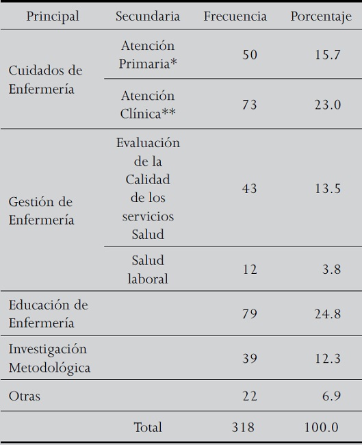 Respecto a las áreas principales abordadas en mayor medida, hubo artículos relacionados con Cuidados de enfermería (39%) y al interior de estos 16% corresponde a atención primaria (salud comunitaria, salud en el hogar, de la familia, de salud pública), 23% a la atención clínica con una variedad en 19 áreas de enfermería, entre estas destacan por su frecuencia enfermería geriátrica, obstétrica y de cuidados críticos. El otro ámbito que sigue en importancia son artículos relativos a la Educación de enfermería (25%).