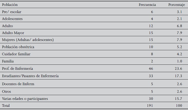 Lo más destacable en la Tabla 4, es que en poco menos de la mitad de los artículos, la población de estudio la constituyen profesionales, estudiantes, pasantes o docentes de enfermería, en cambio en los otros grupos, objeto de cuidado de enfermería, los porcentajes son menores al 10 %, sobresalen adultos, adultos mayores y mujeres, aunque hay un 15% de artículos en que se considera a población de diversas edades.
