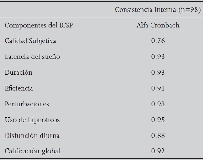 La calidad y cantidad de sueño se midió mediante la aplicación del Índice de Calidad del Sueño Pittsburgh (ICSP). Se utilizó el ICSP, ya que está validado al castellano en población colombiana y su consistencia interna posee un coeficiente de confiabilidad promedio de 0.78; según otro estudio, el mayor coeficiente de confiabilidad corresponde a 0.71 para la población chilena13,14.