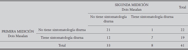 Respecto a la presencia de síntomas diurnos como: Somnolencia considerada como deseos irresistibles de dormir durante el día en momentos que no se debería; Irritabilidad como la sensación de sentirse menos tolerante y reactivo frente a situaciones que antes no le daba importancia, fatiga considerada como sensación de cansancio, hasta agotamiento y falta de fuerza para realizar tareas cotidianas; dolor de cabeza persistente o intermitente que interfiere la sensación de bienestar, se observa que 12 adultos mayores de la muestra, pasaron de tener sintomatología diurna en la medición previa a no tenerla en la segunda medición. Este cambio es estadísticamente significativo.
