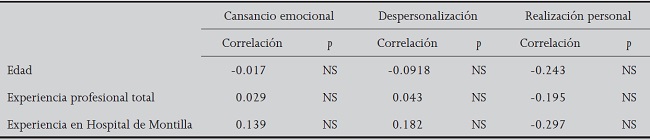 Se utilizó el coeficiente de correlación de Pearson para determinar si existe asociación entre las tres dimensiones del síndrome de desgaste (agotamiento emocional, despersonalización y realización personal) y cada uno de los nueve factores a través de los cuales se mide la presencia de estresores en la Nursing Stress Scale. En particular estudiar si se produce asociación entre las tres dimensiones del síndrome de desgaste y la edad; investigar si hay asociación entre el desgaste profesional y el número de años de experiencia laboral.