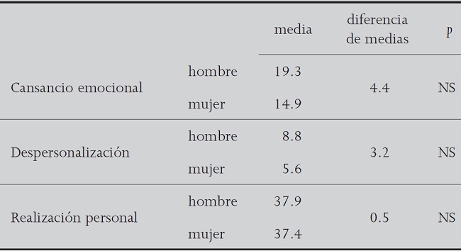 Aunque no se alcanzó significancia estadística, se observó diferencia de niveles de desgaste profesional según el sexo: los hombres de este estudio muestran niveles más altos de despersonalización y cansancio emocional, que discrepan con las consideraciones que señala Martínez Pérez 8, según el cual las mujeres pueden verse en una situación más estresante, por poder tener su capacidad de decisión más restringida en comparación con sus compañeros hombres y/o porque suelen estar más implicadas en el cuidado de los hijos o las tareas domésticas. Otros estudios no encuentran igualmente significación estadística para poder señalar que uno u otro sexo sean más proclives a desarrollarlo 4,5.