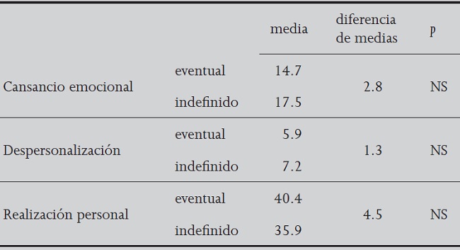 La situación es bastante similar si comparamos el burnout según el tipo de contrato laboral o indefinido. Si bien el personal eventual tiene niveles más favorables respecto al síndrome (menor cansancio emocional, menor despersonalización, mayor realización personal), estas diferencias no pueden ser generalizadas a la población total (Tabla 4).