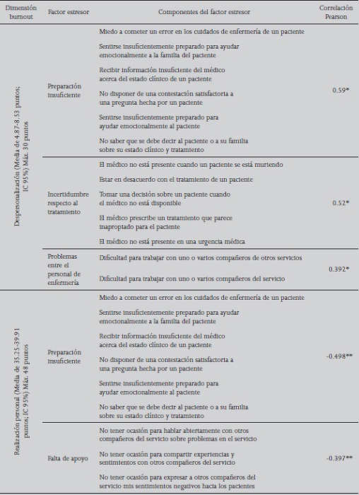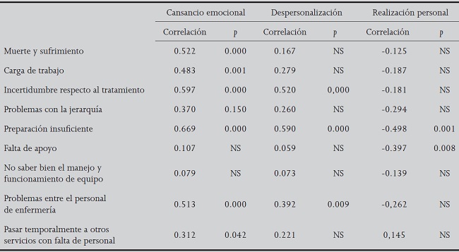 En la Tabla 5 se presentan las correlaciones entre las subescalas del Maslach Burnout Inventory y los factores evidenciados por la Nursing Stress Scale.