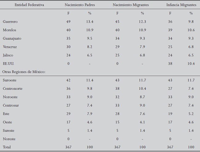 Con la intención de conocer el origen y contexto cultural se les cuestionó sobre la edad a la que dejaron de vivir con sus padres, de qué Estados de la República son originarios los migrantes y sus padres y el lugar en donde vivieron su infancia. En este grupo de repatriados en relación con el Estado de origen de sus padres, nacimiento e infancia del migrante destacan cinco: Guerrero, Morelos, Guanajuato, Veracruz y Jalisco (Tabla 1), cabe mencionar que dentro de los estados donde pasan su infancia los migrantes sobresalen los EE.UU (10.4%); con respecto a la edad de independencia familiar 42% (156) dejaron de vivir con sus padres entre los 16 y 20 años, 32% (117) entre los 10 y 15, 13% (46) entre los 21 y 30 años.