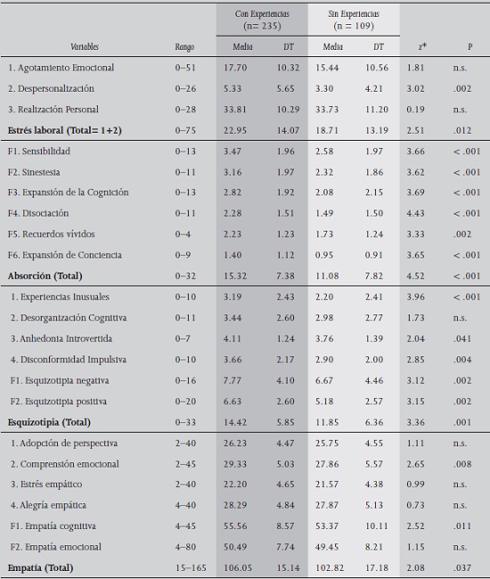 De acuerdo con la H1 según la cual el personal de enfermería que sentía/percibía experiencias tenderían a puntuar más alto en estrés laboral, no se confirmó, sin embargo, el factor “Despersonalizacion” fue más alto que quienes no tenían estas experiencias (Mcon Experiencias= 5.33 vs Msin Experiencias= 3.33, pdif = 0.002). La H2 fue confirmada: Enfermeras/os con experiencias tendieron a reportar mayor Absorción (Mcon Experiencias= 15.32 vs. Msin Experiencias= 11.08, pdif < 0.001), que incluyeron los seis factores (todas pdif < 0.001). (MconEXPERIENCIAS = 14.42 vs. Msin Experiencias= 11.85, pdif = .001), Esquizotipia negativa (Mcon Experiencias= 7.77 vs. Msin Experiencias= 6.67, pdif = .002) y Esquizotipia positiva (Mcon Experiencias= 6.63 vs. Msin Experiencias= 5.18, pdif = 0.002) con énfasis en experiencias inusuales (pdif < 0.001), lo cual confirmó la H3. En relación con la empatía, el H4 no se confirmó, no obstante, el personal de enfermería que informaron estas experiencias tendieron marginalmente a reportar mayores puntuaciones de empatía (Mcon Experiencias= 106.05 vs. Msin Experiencias= 102.82, pdif = 0.037) que el grupo sin Experiencias. Un análisis de corrección Bonferroni excluyó el estrés laboral (pdif = .012); y dos factores de empatía, Empatía cognitiva (pdif = 0.01) y Comprensión emocional (pdif = .008), asimismo eran más propensos a puntuar más alto que el grupo sin Experiencias (ver Tabla 2).