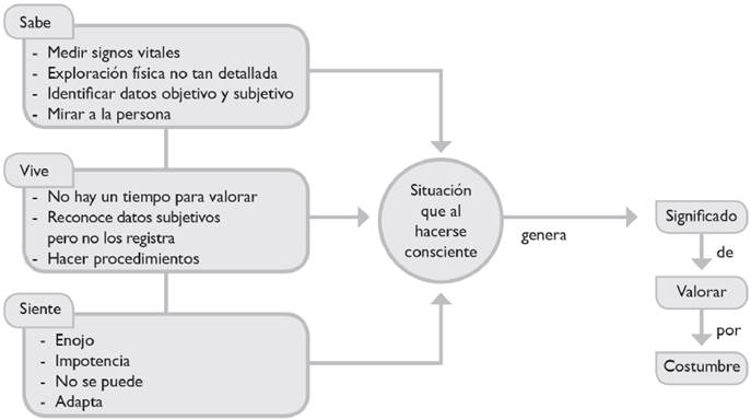 Tal como lo señala Medina43, cada vez que el estudiante se acerca a la persona que cuida, hay conocimiento teórico y habilidades tácitas de la valoración que le permiten mirar las necesidades de la persona, inspeccionar las condiciones físicas de la piel antes de realizar un procedimiento que conlleva de manera implícita un razonamiento y juicio clínico5 para elegir la vena que va puncionar, determinar el grado de dolor de la persona o reconocer la información importante, pero se soslaya al no reflexionarse de forma consciente.