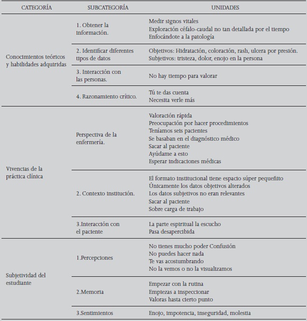 Los resultados que se presentan en este escrito corresponden al estudio: “Significado de la valoración clínica de enfermería por estudiantes de la Escuela Nacional de Enfermería y Obstetricia”31 donde se señalan las categorías y subcategorías para cada uno de los significados hallados.