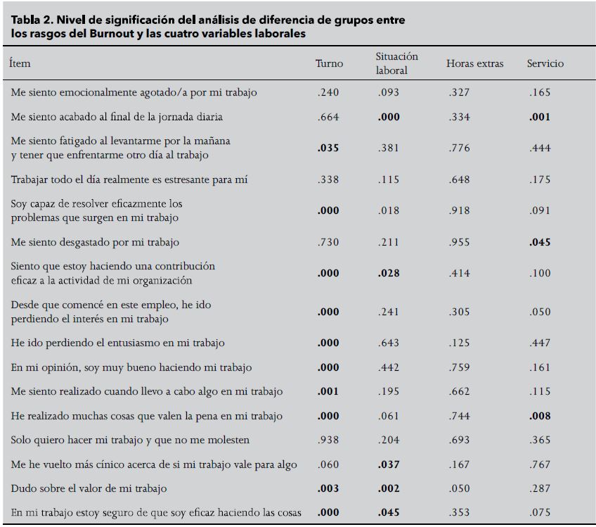 A pesar de que, aparentemente, el estudio de variables antecedentes de este síndrome ya ha sido suficientemente abordado, y aparecen en las revisiones teóricas o estados del arte elaborados al respecto28, es necesario considerarlas poco exploradas por sus resultados no concluyentes. En el caso de la presente investigación se puede concluir que las variables laborales estudiadas (turno de trabajo, situación laboral, el realizar horas laborales extras y servicio en el que se encuentra actualmente), pueden marcar una diferencia significativa en el nivel con que se presentan algunos rasgos o dimensiones del Burnout; sin embargo, estos resultados siguen marcando el carácter complejo y multifacético con que aparecen las variables antecedentes de dicho síndrome, sean estas sociodemográficas, laborales u organizacionales por lo que se considera necesario continuar con mayores estudios al respecto, a fin de que la acumulación de evidencia empírica ayude a determinar cuáles son verdaderamente las variables antecedentes del síndrome.