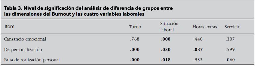 Resultados: De las cuatro variables estudiadas (turno de trabajo, situación laboral, el realizar horas laborales extras y servicio en el que se encuentra actualmente), es la del turno laboral la que marca una diferencia significativa en el nivel en que se presenta el síndrome de Burnout en el personal de enfermería.