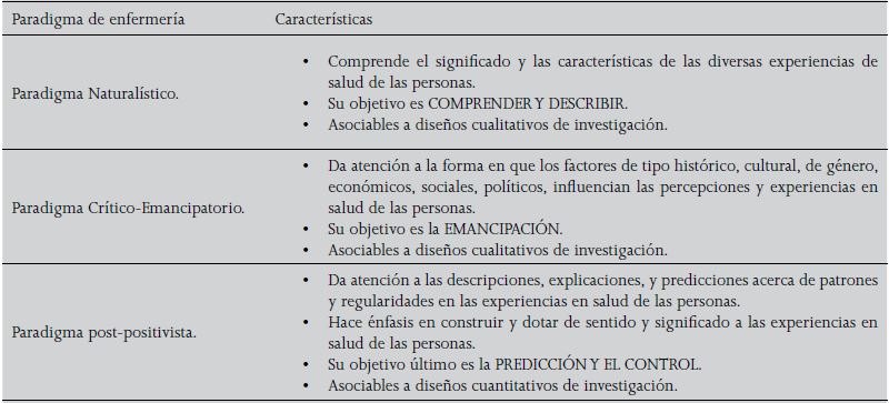La “visión” de paradigma descrito desde Kuhn, fluctúa en aplicabilidad y coherencia si se contrasta con las “visiones” descritas por Fawcett, para quien varios paradigmas del conocimiento (en vez de uno solo), son relevantes a Enfermería debido a que únicamente así puede orientarse y guiarse el desarrollo del conocimiento disciplinar; ello en atención a que varios paradigmas presentan mayor capacidad para describir, interpretar, explicar y predecir la complejidad de la experiencia del Acto de Cuidado, mejor que un solo paradigma16. Bahramnezhad et al.17, refiere que el desarrollo de diversos y múltiples postulados acerca de su naturaleza epistemológica, mantiene a la Enfermería en un nivel pre-paradigmático, situación que implica para la Disciplina un desgaste de energía, desconcierto y confusión17. Para Fawcett los paradigmas en enfermería corresponden a tres categorías (Tabla 1):
