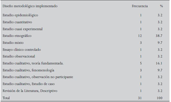 Dado que las tesis constituyen piezas divulgativas del conocimiento científico de cualquier disciplina, se justifica por ello hacer una revisión preliminar de una muestra de tesis postgraduales (de los PhD en Enfermería colombianos), a fin de dar cuenta de las características y calidad de la generación de conocimiento nuevo de enfermería desde las instancias ya referidas. Tras realizar un muestreo a conveniencia de las piezas divulgativas de nuevo conocimiento de enfermería [n = 31], las cuales fueron desarrolladas en el rango de tiempo: 2006 - 2013, se pudo identificar que los productos de dichas investigaciones corresponden en un 38.7% a etnografías, seguidas por un 16.1% de los estudios vinculados a teoría fundamentada; un 9.7% corresponden a estudios mixtos y fenomenológicos (cada uno); los estudios cuantitativos, epidemiológicos y cuasi experimentales representan la minoría de la muestra, (ya que no superan más del 3.5% cada uno, como puede verse en la Tabla 2.