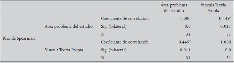 A su vez, al plantear la correlación entre las áreas problema de estudio , y la vinculación o no (clara, específica y argumentada), de modelos y teorías conceptuales de enfermería de cualquier rango, se evidenció un coeficiente de correlación de Spearman de 0.44, el cual evidencia un nivel de correlación positiva - media, el cual puede interpretarse como efectivo, con el propósito de encontrar formas de transición de la enfermería hacia un conocimiento revolucionario (Tabla 3).