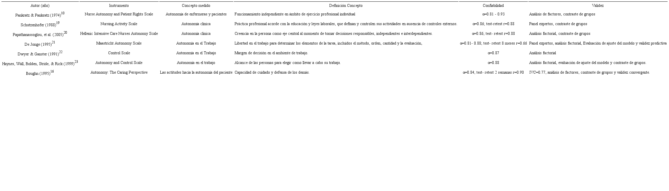 Existen otros conceptos como el Control Over Nursing Practice (CONP), el cual orienta su atención a las condiciones organizacionales para el desempeño de la labor enfermera y el concepto de independencia, que aunque se reconoce como un fenómeno diferente de la autonomía, algunos trabajos lo consideran una actividad (trabajar independientemente) que se realiza en el marco de la autonomía24; por lo anterior, es importante aclarar que la clasificación propuesta por las autoras de este trabajo, sólo incorpora instrumentos que han evaluado el constructo autonomía.