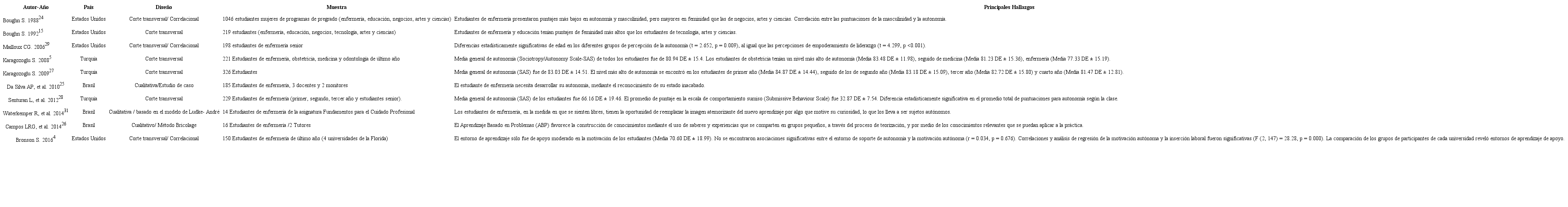 Todos ellos han realizado una única medición, la mayoría desarrollados desde un enfoque cuantitativo mediante un diseño de estudio de corte transversal4,5,15,27,29 y otros abordados desde la perspectiva cualitativa10,30. En general, el objetivo principal de los estudios ha sido determinar el nivel de autonomía y en algunos casos comparar dicha autonomía con estudiantes de otras carreras5,27,28. Adicionalmente, algunas investigaciones también han explorado la correlación entre la autonomía y factores como: ocupación de los padres, promedio de calificaciones, prueba de aptitud académica, percepción de empoderamiento del liderazgo, percepción de autonomía, edad, masculinidad y comportamiento sumiso15,28,29.