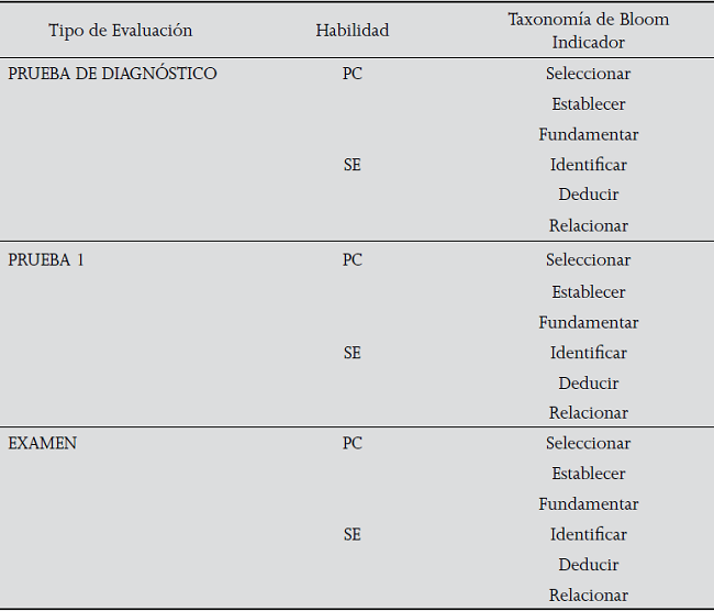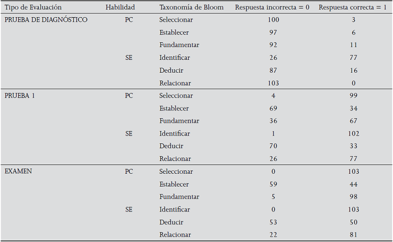 El criterio para establecer la adquisición de la habilidad de PC por el estudiante fue que él realizara dos o más de los indicadores descritos a partir de la taxonomía de Bloom (tales como: seleccionar, describir y/o fundamentar). De igual manera para la habilidad SE, los estudiantes debían tener correctas dos o más de las variables establecidas para su medición (tales como: identificar, deducir y relacionar).