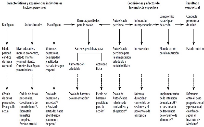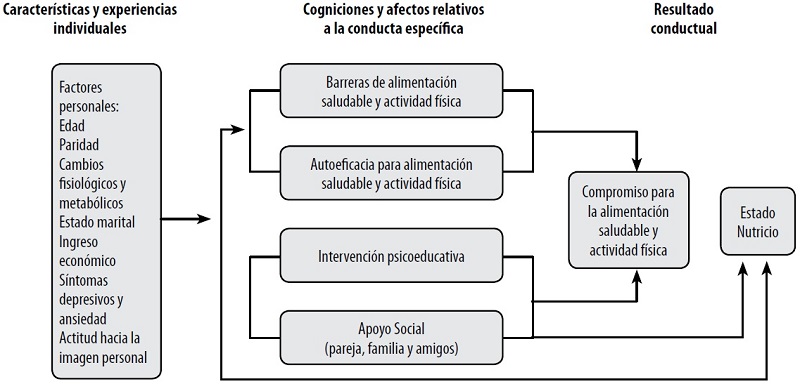 Autoeficacia percibida para alimentación saludable y AF se deriva del concepto de autoeficacia percibida del MPS, se define como la comprensión y habilidad de la mujer gestante para realizar acciones de alimentación saludable y AF. La autoeficacia influye sobre las barreras de acción percibida, de manera que a mayor autoeficacia, conlleva una menor percepción de las barreras para el desempeño de llevar una alimentación saludable y AF, medida con la escala de autoeficacia relacionada con la dieta, el ejercicio y control del peso46.