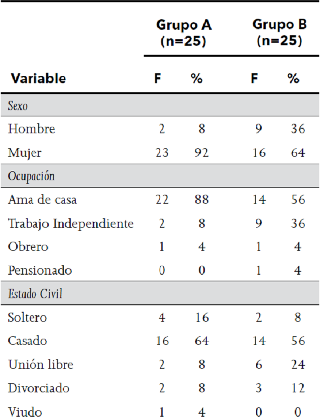 La muestra estuvo compuesta por 50 participantes, repartidos entre el grupo A y B; el primero lo conformaron 25 personas que asistían al grupo de ayuda mutua y el segundo, 25 personas que se encontraban en control ambulatorio. El promedio de edad fue de 59.8 años en ambos grupos (DE=11.64; rango=36-82). En relación con el sexo, en su mayoría fueron mujeres con un 78% (n=39) y 22%(n=11) hombres (Tabla 1).