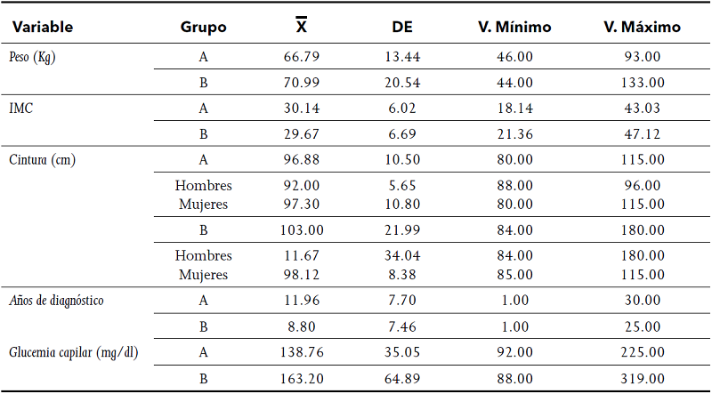 Los resultados de las características clínicas y antropométricas de los participantes mostraron, con respecto a los años de diagnóstico, una media de 10 años; hay presencia de sobrepeso y obesidad, por lo tanto, el riesgo cardiovascular es alto en ambos grupos; de igual manera la media de la glucemia capilar se encontró en el parámetro descontrolado. Las características antropométricas antes mencionadas fueron similares a estudios realizados en San Luis Potosí (México), Brasil y Japón, de estos la media de la glucosa fue mayor en el estudio realizado en México 20-22.
