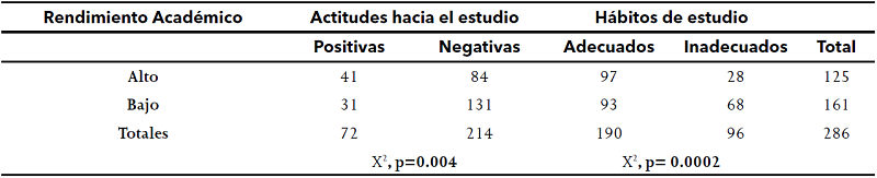 Results: From the total of participants (n=286), 75.8% were female, while 43.7% (n=125) showed high academic performance with a 9/10 or higher grade average. Regarding the study habits, and 66.4% (n=190) obtained an adequate classification score; and 25.2% (n=72) showed positive attitudes towards studying. The correlation related to habits and attitudes towards studying was found to be r=0.461, p<0.05; while the logistic regression analysis revealed positive associations between study attitudes and academic performance.