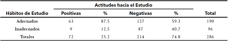 Se realizó una prueba de chi-cuadrada para evaluar la asociación entre los hábitos y las actitudes hacia el estudio, se observó que del 25.2% (72) de los alumnos con actitudes positivas, el 87.5% (63) tuvieron hábitos adecuados de estudio, mientras que, del 74.8% (214) que presentaron actitudes negativas hacia él estudio, el 40.7% (87) mostraron malos hábitos de estudio. Estas diferencias fueron estadísticamente significativas (p=0.001), Tabla 2.
