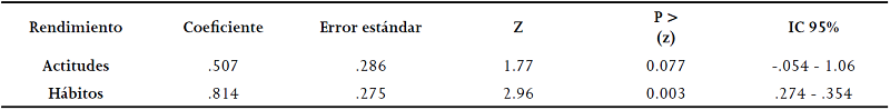 Un análisis de regresión logística reveló asociaciones positivas similares entre las actitudes hacia el estudio y el rendimiento académico (OR=2.1, IC 95%=1.2-3.5, p<0.01), y entre los hábitos de estudio y el rendimiento (OR=2.5, IC 95%=1.5- 4.3, p<0.001). Cuando se ingresaron ambas variables independientes en el análisis de regresión para explorar la interacción, entre ellas, se observó que la actitud tiene una influencia positiva en los hábitos de estudio, de modo que en la ecuación de regresión la actitud pierde significancia a favor de los hábitos de estudio. El coeficiente de regresión para la actitud resultó de 0.51 pero la asociación perdió significancia (p=0.077), mientras que para los hábitos de estudio el coeficiente beta resultó de 0.81 y significativo (p=0.003) Tabla 3.