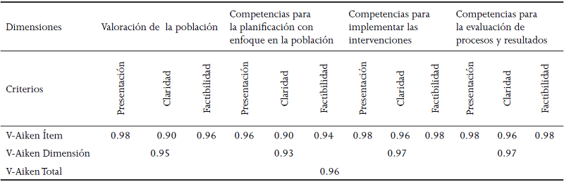 Se realizó la prueba V-Aiken al instrumento de Evaluación de las Competencias del Profesional de Enfermería, que consta de cuatro dimensiones, en cada una de estas se evaluó presentación, claridad y factibilidad. Se obtuvieron resultados por ítems, por dimensión y escala total, este último resultado fue de 0.96 (Tabla 1), que demuestra alto grado de concordancia entre el juicio de los profesionales.