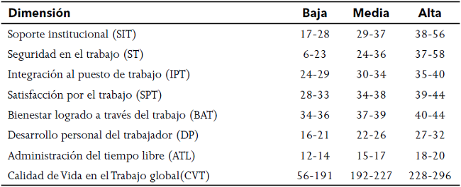 CVT-GOHISALO se compone de 74 ítems divididos en siete dimensiones: 1) soporte institucional para el trabajo (SIT), 2) seguridad en el trabajo (ST), 3) integración al puesto de trabajo (IPT), 4) satisfacción por el trabajo (SPT), 5) bienestar a través del trabajo (BAT), 6) desarrollo personal (DP) y 7)administración tiempo libre (ATL), cada una de las cuales puede ser calificada de forma individual o en conjunto19,20 (Tabla 1). Cada item se evalúa con escala tipo Likert con puntuación de 0 a 4, el cero corresponde al mínimo de satisfacción/ acuerdo/ frecuencia/ compromiso y el cuatro al máximo de cada valoración.