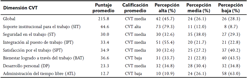Promedio CVT global: 215.8 (DE=43.3), que indica nivel medio de CVT. Promedios CVT por dimensiones: Soporte institucional para el trabajo (SIT)=44.6 (DE=10.2), Seguridad en el trabajo (ST)=30 (DE=11.7), Integración al puesto de trabajo (IPT)=33.4 (DE=6.1), Satisfacción por el trabajo (SPT)=34.9 (DE=6.8), Bienestar logrado a través del trabajo (BAT)=36.6 (DE=5.7), Desarrollo personal (DP)=23.3 (DE=6.4) y Administración del tiempo libre (ATL)=12.7 (DE=4.2). Clasificación CVT por dimensiones: SIT: nivel alto; ST, IPT, SPT y DP: nivel medio; BAT y ATL: nivel bajo. Anova para prexistencia de trastorno en salud mental y CVT global, dimensiones SIT, ST, IPT, SPT, BAT, DP y ATL con valor p=0.000; p=0.000; p=0.017; p=0.005; p=0.000; p=0.001 y p=0.046 respectivamente.