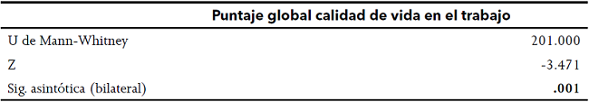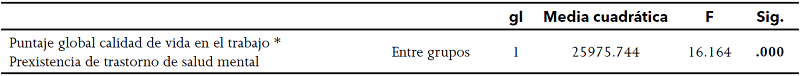 En cuanto a la relación entre variables, se detectó mediante ANOVA (Tabla 3) y U de Mann-Whitney (Tabla 4), asociación estadísticamente significativa entre Calidad de vida en el trabajo Global y Prexistencia de trastorno en salud mental, esto establece que obtener un bajo puntaje en la CVT global se asociaría a haber sido diagnosticado con alguna patología en salud mental (depresión) en algún momento de la vida. Cabe destacar que para dicho entrecruzamiento se desestimó la respuesta estrés laboral, debido a que solo se documentó un caso.