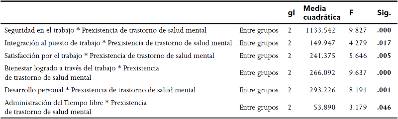 También, existió asociación estadísticamente significativa entre las dimensiones Seguridad en el trabajo, Integración al puesto de trabajo, Satisfacción por el trabajo, Bienestar logrado a través del trabajo, Desarrollo personal, Administración del Tiempo libre con la variable Prexistencia de trastorno de salud mental (Tabla 5), es decir, cuando existe menor satisfacción en dichas dimensiones, los sujetos presentan antecedentes de haber sido diagnosticados con depresión alguna vez en la vida.