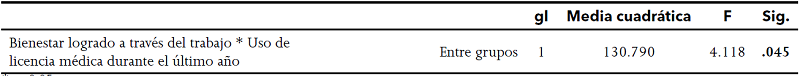 Finalmente, se detectó asociación entre la dimensión Bienestar logrado a través del trabajo y la variable Uso de licencia médica durante el último año (Tabla 6), lo que se traduce en que aquellos docentes que hicieron uso de licencia médica durante el último año, presentaron menores niveles de CVT en dicha dimensión.