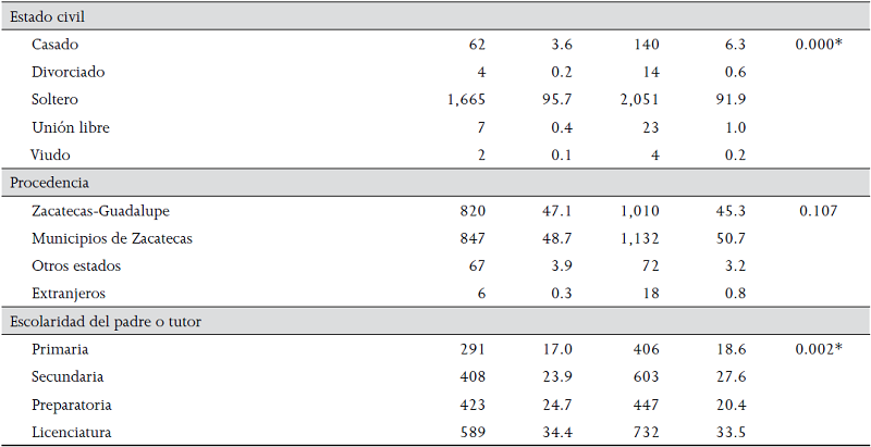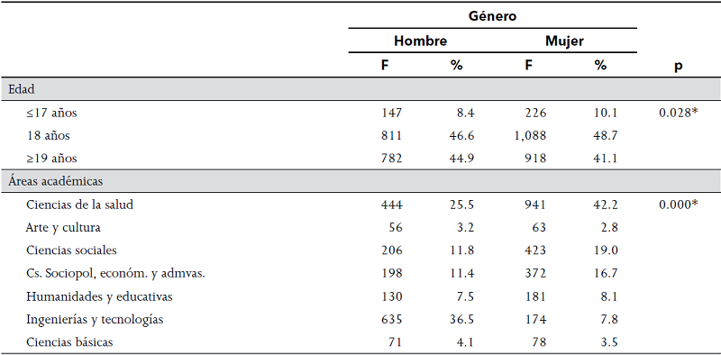 Se obtuvo un total de 3,972 historias clínicas con datos válidos de los cuales 2,232 fueron mujeres, que representan el 56.1% de la muestra (20.1 ± 5.1 años) y 1,740 fueron hombres, que representan el 43.8% de la muestra (19.8 años ± 4.3 años). Se agruparon en 3 categorías de edad de ≤17 años (9.3%), 18 años (47.8%) y ≥19 años (42.8%). Se logró obtener información de 33 de las 40 licenciaturas que ofrece la UAZ, divididas en sus siete áreas académicas, con mayor representatividad del área de ciencias de la salud (34.8%), seguida del área de ingenierías y tecnologías (20.3%), así como de las áreas de ciencias sociales (15.8%) y ciencias socio-políticas económicas y administrativas (14.3%). Los hombres predominan en el área de ingenierías y tecnologías (36.5%), seguido del área de ciencias de la salud (25.5%). Por su parte, las mujeres tienen mayor presencia en áreas de: ciencias de la salud (42.2%), ciencias sociales (19.0%) y de ciencias socio-políticas económicas y administrativas (16.7%). Con respecto al estado civil, el 93.5% de los estudiantes se encontraban solteros al momento de la entrevista (Hombres 95.7%; Mujeres 91.9%). De acuerdo a la procedencia de los estudiantes, 1,830 (46.0%) provienen del área conurbada Zacatecas-Guadalupe, 1,979 (49.8%) proceden de los 56 municipios restantes del estado de Zacatecas, y los demás alumnos son de otros estados o del extranjero (Tabla 1).