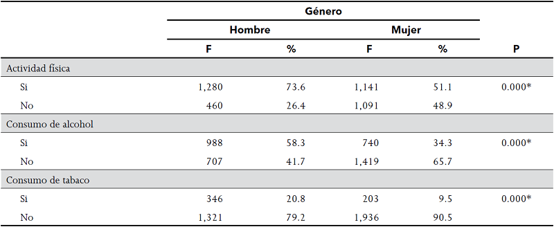 En lo que concierne a la práctica de actividad física y estilos de vida no saludables (Tabla 2) se encontró que los hombres realizan mayor actividad física que las mujeres (73.6% vs 51.1%), consumen más alcohol (58.3% vs 34.3%) y tabaco (20.8% vs 9.5%), todas las diferencias entre variables tienen significancia estadística (p<0.000).