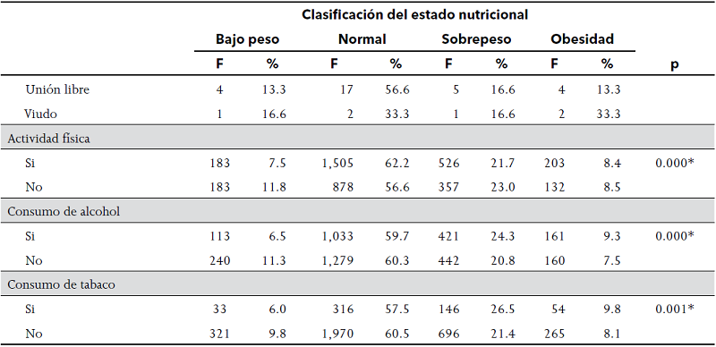 Alrededor de dos terceras partes de la población quedaron clasificadas con peso bajo o peso normal, y 30.6% en sobrepeso u obesidad; los hombres presentaron un porcentaje mayor de sobrepeso y obesidad (24.1% y 9.2%) que las mujeres (20.7% y 7.8%) del estudio (p<0.001). Por otro lado, las prevalencias más elevadas de sobrepeso se observaron en la diferenciación según estado civil, y correspondió a quienes estaban divorciados (61.1%) y casados (40.1%). En cuanto a las variables de prácticas vinculadas con la salud, quienes no realizaban actividad física tienen mayor prevalencia de sobrepeso (23.0%) y obesidad (8.5%) respecto a los que la realizan (21.7% y 8.4% respectivamente). También es mayor el sobrepeso y obesidad en quienes consumían alcohol (24.3% y 9.3%) y quienes fumaban (26.5% y 9.8%), todas las variables anteriores presentaron significancia estadística (p<0.001) (Tabla 3).