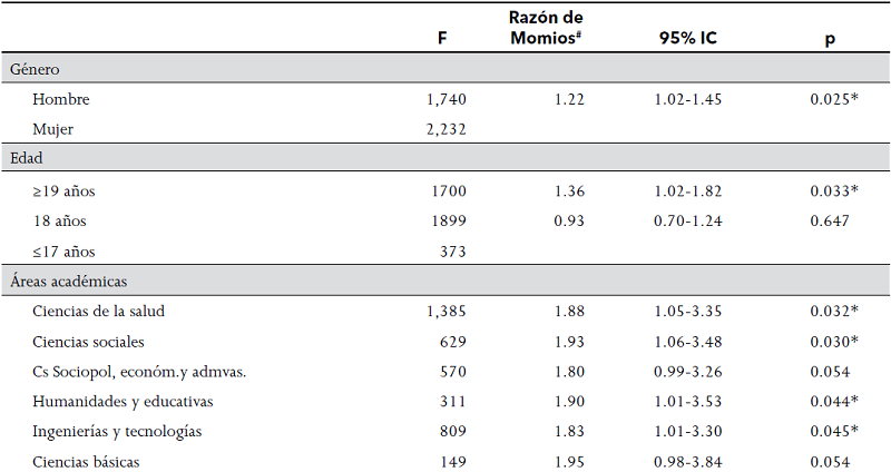 Resultados: Los hombres tienen mayor prevalencia de sobrepeso (24.1%) y obesidad (9.2%) que las mujeres (p<0.001). Los hombres realizan mayor actividad física (73.6% vs 51.1%), consumen más alcohol (58.3% vs 34.3%) y tabaco (20.8% vs 9.5%) (p<0.000). Se encontró una asociación positiva en los momios de sobrepeso en relación con los hombres (RM=1.22, IC 95% 1.02-1.45), edad de 19 años (RM=1.36, IC 95% 1.02-1.45), en las áreas de ciencias de la salud (RM=1.88, IC 95% 1.05-3.35), ciencias sociales (RM=1.93, IC 95% 1.06-3.48), humanidades y educativas (RM=1.90, IC 95% 1.01-3.53), ingenierías y tecnologías (RM=1.83, IC 95% 1.01-3.30).