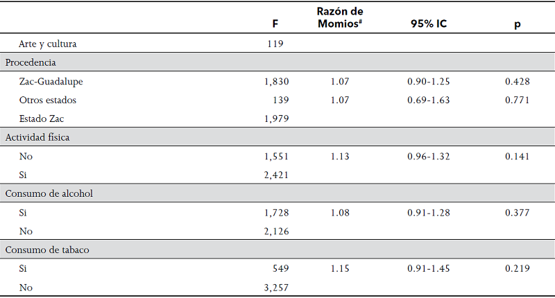Finalmente, se construyó un modelo multivariado con la variable principal de estudio que fue el sobrepeso, se utilizó como covariables el sexo, edad, áreas académicas, procedencia, actividad física, consumo de tabaco y alcohol. Se encontró una asociación positiva en los momios de sobrepeso en relación con los hombres (RM=1.22, IC 95% 1.02-1.45), en el grupo de edad de 19 años (RM=1.36, IC 95% 1.02-1.45), en las áreas académicas de ciencias de la salud (RM=1.88, IC 95% 1.05-3.35), ciencias sociales (RM=1.93, IC 95% 1.06-3.48), humanidades y educativas (RM=1.90, IC 95% 1.01-3.53) e ingenierías y tecnologías (RM=1.83, IC 95% 1.01-3.30). No se encontraron diferencias significativas en los momios de los estudiantes de nuevo ingreso a la UAZ en el grupo de 18 años, de las áreas de ciencias socio-políticas económicas y administrativas, ciencias básicas de Zacatecas-Guadalupe y otros estados, que no realizaban actividad física y sí consumían alcohol y tabaco (Tabla 4).