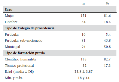 Los resultados se presentan en relación con los objetivos del estudio. La caracterización sociodemográfica de la población en estudio según sexo, edad, tipo de colegio y tipo de formación, se muestran en la Tabla 1, donde se observa que la mayoría son mujeres, provienen de colegios municipales y de formación científico humanista.