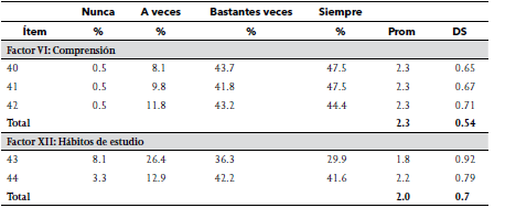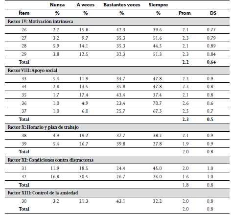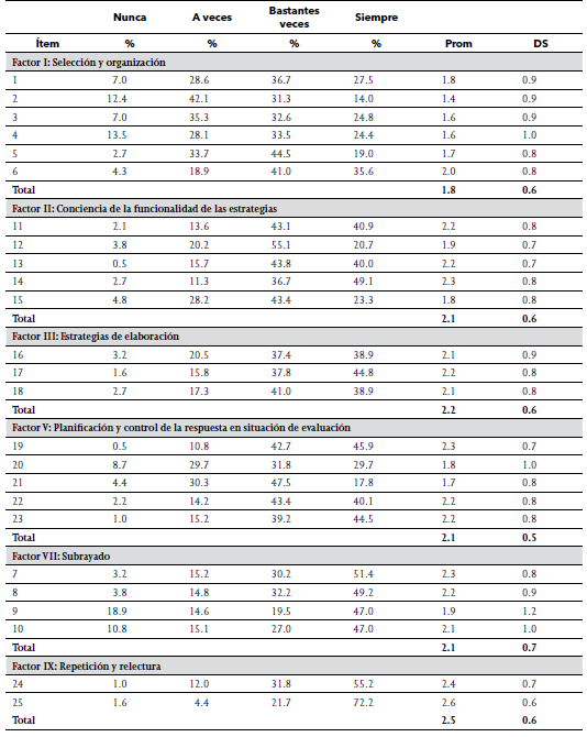 En su totalidad los Factores más valorados son: IX (Repetición y relectura), VIII (Apoyo social) y el VI (Comprensión), lo que coincide con una investigación-intervención con alumnos universitarios, donde las estrategias más utilizadas fueron la lectura y la relectura del material de estudio33.